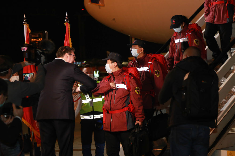 ??這是2020年3月21日,在塞爾維亞首都貝爾格萊德,前來(lái)迎接的塞爾維亞總統(tǒng)武契奇(左)與中國(guó)援助塞爾維亞抗疫醫(yī)療專家組成員“碰肘”致意。新華社記者 石中玉 攝
