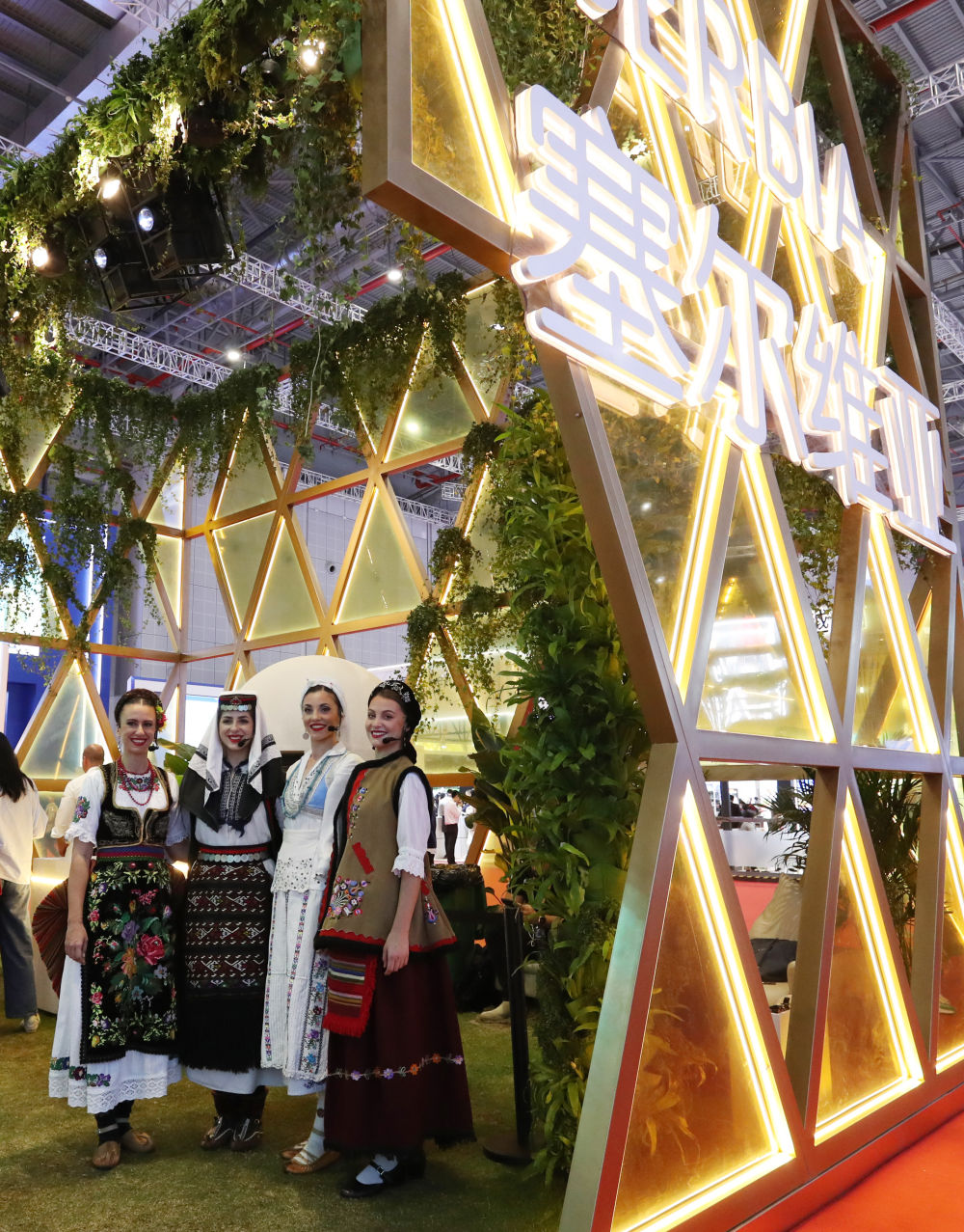 ??2023年11月6日,身著傳統(tǒng)服飾的演職人員在上海進(jìn)博會(huì)國(guó)家展塞爾維亞展臺(tái)迎接參觀者。第六屆進(jìn)博會(huì)國(guó)家展全面恢復(fù)線下舉辦,洪都拉斯、塞爾維亞、越南、南非、哈薩克斯坦作為本屆進(jìn)博會(huì)主賓國(guó)在國(guó)家展亮相。新華社記者 方喆 攝
