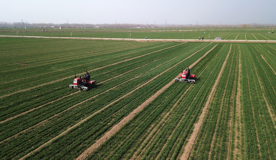 ??山東省汶上縣,農(nóng)民駕駛農(nóng)機(jī)在高標(biāo)準(zhǔn)農(nóng)田里進(jìn)行小麥春季管護(hù)作業(yè)(2024年3月13日攝,無(wú)人機(jī)照片)。新華社記者 徐速繪 攝