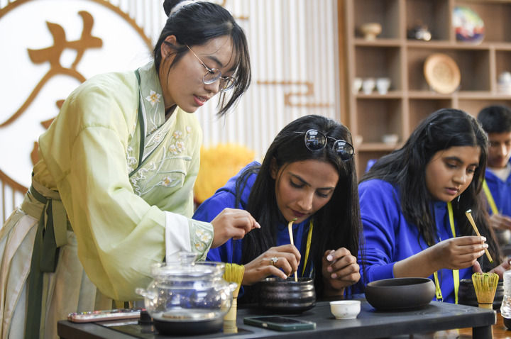 ??2024年4月15日,參加2024年“漢語橋”上合組織國(guó)家青年學(xué)生春令營(yíng)的來華青年學(xué)生在新疆師范大學(xué)學(xué)生(左)的指導(dǎo)下學(xué)習(xí)茶藝。新華社記者 王菲 攝