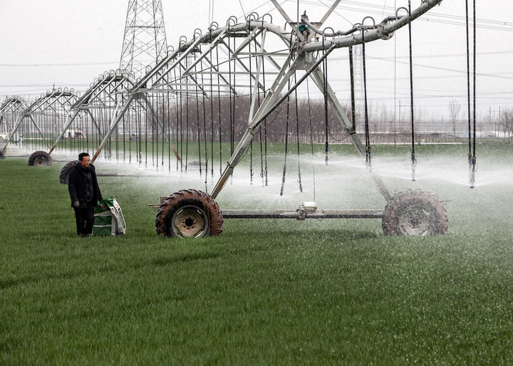 ??2024年3月18日,在河南省焦作市博愛縣孝敬鎮(zhèn)東原莊村瑞輝家庭農(nóng)場,村民使用全自動指針式噴灌機進行澆灌作業(yè)。新華社發(fā)(程全攝)