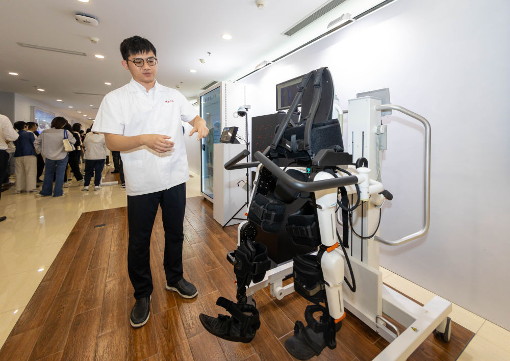 ??2024年5月24日,在位于上海市嘉定區(qū)的上海交通大學(xué)醫(yī)學(xué)院附屬瑞金醫(yī)院腫瘤質(zhì)子中心,工作人員介紹由瑞金醫(yī)院醫(yī)生和醫(yī)療公司共同研發(fā)的用于恢復(fù)患者下肢的醫(yī)療機(jī)器人。新華社記者 王翔 攝