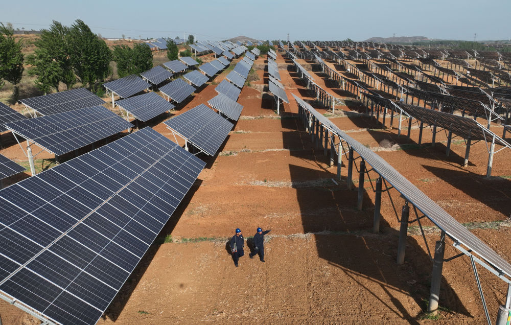 ??2024年4月16日,工人在河北省石家莊市靈壽縣譚莊鄉(xiāng)程家莊村的“農(nóng)光互補(bǔ)”光伏發(fā)電場(chǎng)巡查(無(wú)人機(jī)照片)。新華社記者 楊世堯 攝