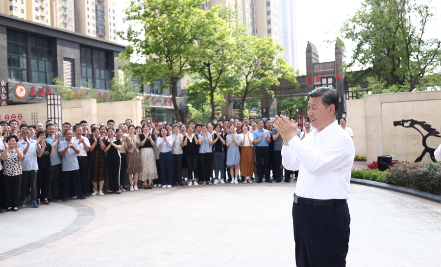 ??2022年6月28日,習近平總書記在東湖高新區(qū)左嶺街道智苑社區(qū)廣場同干部群眾親切交流。新華社記者 鞠鵬 攝