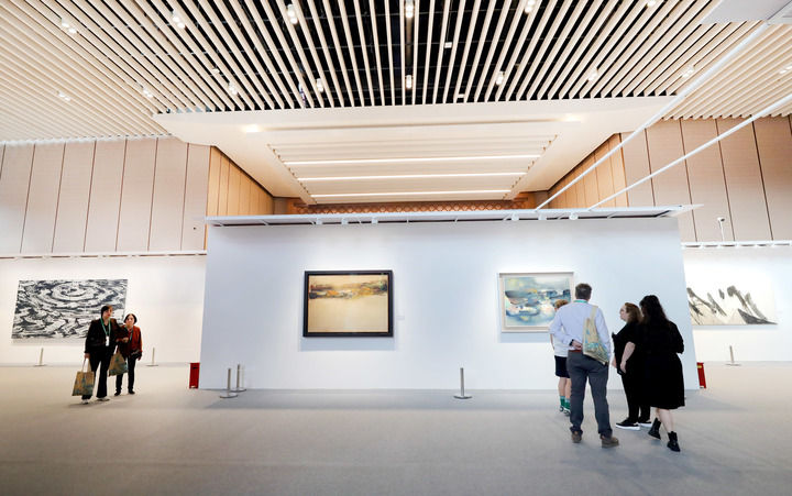 ??11月9日,觀眾在第七屆進(jìn)博會(huì)國(guó)際現(xiàn)當(dāng)代藝術(shù)專區(qū)觀看繪畫(huà)藝術(shù)展品。新華社記者 方喆 攝